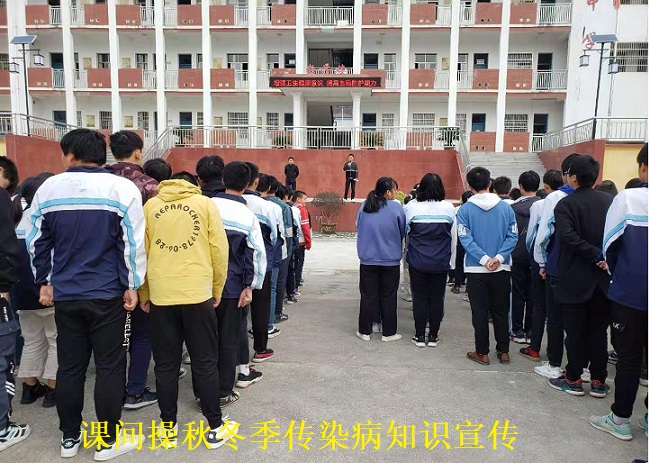 秋冬季是传染病高发季节,学校是人群高度密集的场所,师生又是传染病易感人群之一。特别是疫情防控常态化下,为有效预防与控制传染病在学校的发生和流行,确保师生身体健康,增强和提高学校师生自我防病意识。11月23日,草盘中学利用课间操向全校师生开展秋冬季传染病预防知识宣传教育。