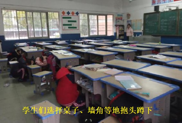 之后开始了疏散演习环节,随着一阵急促的警报声响起,学生们在老师的引导下,纷纷选择桌子、墙角等地方进行躲避,老师们不时地提醒着孩子们“抱头”“蹲下”。两分钟后,警报声再次响起,孩子们在老师的带领下,抱头弯腰,快速有序地经过安全出口,撤离到安全区域。