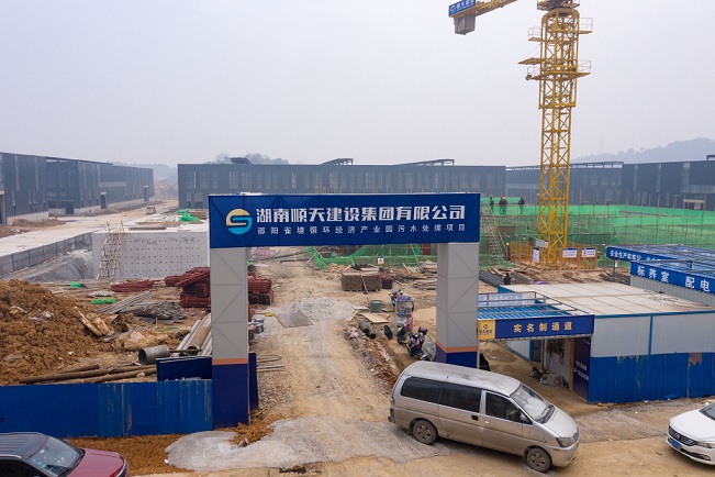 清风网讯(通讯员:陈坤刚)12月27日上午,冬日暖阳高照,邵阳雀塘再生资源产业园二期标准化厂房建设项目工地现场,彩旗招展,厂房林立,中间污水处理站项目工地上塔吊高耸,机械轰鸣,挖掘机械铁臂挥舞,工程车来回穿梭,50余人施工作业,施工场面热火朝天。