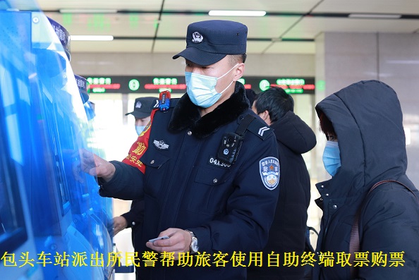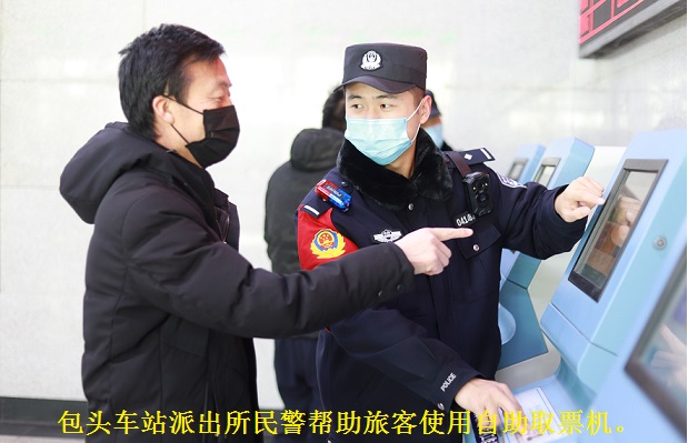 在包头东火车站,铁路民警向进站旅客开展安全出行宣传,并耐心解答旅客问询;同时,对老幼病残孕等旅客进行重点帮扶,为他们搬运行李,开通“爱心通道”。在包头火车站,铁路民警在售票厅帮助旅客使用自助终端取票购票,在出站口帮助旅客注册使用健康码,助力不善于使用智能设备的老年旅客顺利出行。