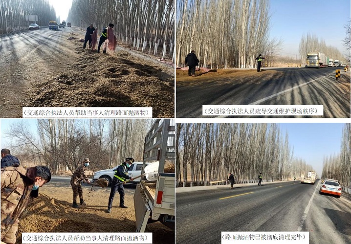 见此情景,沙雅执法大队立即组织人员疏导交通,依次有序放行车辆,同时联系辖区沿线乡镇调派铁锹、扫把、车辆等物质,对抛洒在公路路面的十余袋油渣进行清扫拉运。经过近一个小时的奋力清除,抛洒的油渣全部清理完毕,彻底安全消除隐患,车辆恢复运行。