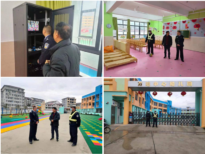 清风网讯(通讯员: 方娜 沈蕾 李永存)为进一步消除安全隐患,全面做好当前幼儿园的校园安全工作,给幼儿创造一个安全的学习生活环境,2021年2月28日上午,湖北省英山县公安局方家咀乡派出所熊伟所长带领干警们深入方家咀乡中心幼儿园查看督办校园安全工作,为幼儿开学保驾护航。干警们走进校园认真地查看了幼儿园消防设备、一键报警设备、幼儿园各处监控设备,现场查看了门卫、厨房及操场玩具区等场所一系列的安全措施,以及校园安全管理制度,检查结束后及时与学校负责人沟通,要求学校严格落实校园安全防范措施,加强对校园的出入人员、物品的安全检查与登记力度,严防不法人员和杜绝闲杂人员进入校园,校园监控设备要无死角覆盖,切实保障学校公共财产及在园师生的安全。