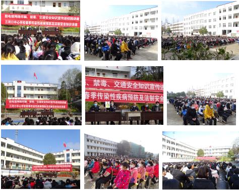 三河口镇卫生院、三河口公安派出所、三河口中心学校等相关单位负责人到活动现场,就春季传染性传染病预防暨法制安全知识,以及防电信网络诈骗、禁毒、交通安全知识进校园,给800余名师生讲座。告诫学生注意春季疾病预防,注重校园安全与生命安全,学会运用法律武器保护自己。