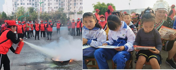 志愿者们走街串巷,向村上的居民们发放宣传资料,讲解树立安全防火意识的重要性:退休教师杨文秀阿姨为居民示范水醮棉纱捂鼻自救;电力退休职工杨忠叔叔用傣语为傣族群众讲解怎样安全用电;正值周末,志愿者还特地为孩子们细致讲解了未成年人如何正确预防火灾。