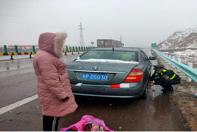 清风网讯(通讯员: 佧米力江·托力干)4月18日,乌恰县突下雨夹雪,因气温较低路面有结冰风险,为了及时排查路面安全隐患,乌恰执法大队执法人员开展辖区公路巡查工作。巡查至G3013线K38+800米处时,发现一辆私家车在无安全防护措施的情况下停在高速公路上。执法人员立即靠边停车询问情况,得知该车由于车速较快导致轮胎破裂无法行驶,自身未携带工具,得知情况后我执法大队人员立即放置安全锥桶,指挥过路车辆减速慢行并用执法车随车工具更换备用轮胎。经过十几分钟的努力,备胎换好排除故障,驾驶员高兴的对乌恰大队执法人员竖起了大拇指并说道“感谢你们的雨雪中换‘胎’,帮我解决了困难!”。