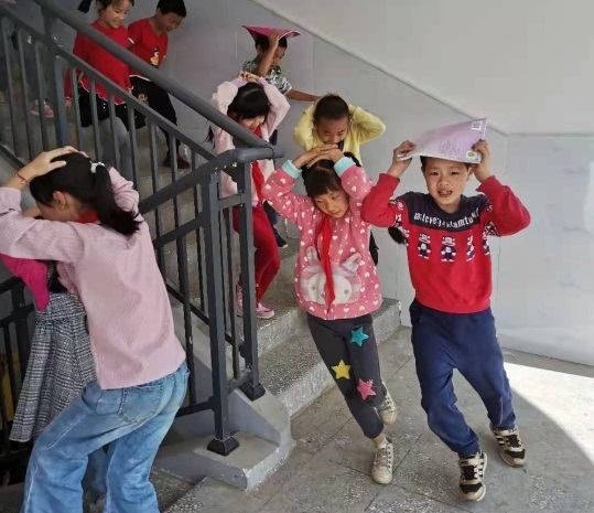 上午9:20分防震演练开始,第一声警报声响起,同学们迅速保护头部,趴入桌子底下,并用手臂,书护住头部。第二声疏散信号响起,师生们按照制定的路线,仅用不到2分钟时间,全体师生就有序快速撤离到学校空旷地带,老师及时清点学生人数。全程迅速、紧张、有序。