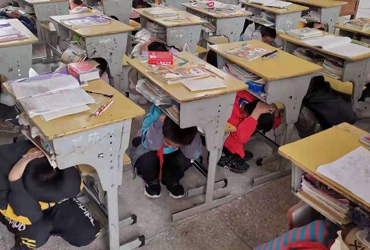 随着地震警报的拉响,同学们双手护住头,蜷缩身体,迅速躲进课桌下面进行避险,随后,各班指导老师迅速协助学生撤离教室,到事先指定的地点集合。待学生到达操场指定位置后,及时维持好学生纪律,清点报告人数,确保不落一人。整个演练过程紧张有序,短时高效。