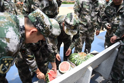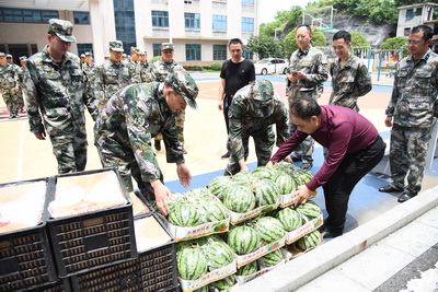 考虑到天气炎热,抗洪抢险分队训练十分辛苦,北塔区退役军人事务局购买了猪肉、西瓜、苹果、矿泉水等慰问物资,来到区人武部训练场,看望慰问抗洪抢险分队的战士们,让他们在炎炎夏日里切实感受到来自区委区政府的温暖和关怀。“这西瓜真甜,吃完后感觉还能再跑五圈!”吃着西瓜的民兵对慰问人员表示感谢,并笑着说道。