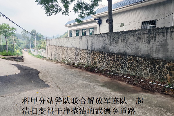 当天,科甲分站警队与驻地解放军连队带上扫把、铁锹等卫生工具,一起将道路两侧的生活垃圾和枯枝落叶进行了彻底清扫,细致清理了淤积的排污水沟,认真清除了河沟旁的的杂物和垃圾,绝不放过任何一个卫生死角。清扫过程中,大家团结协作,分工有序,一个个都卯足了干劲,齐心协力将道路打扫得十分干净整洁。在大家的共同努力下,武德乡的道路畅通无阻碍,面貌焕然一新,往来的群众和车辆也同时拥有了一个安全舒适整洁的出行环境,纷纷为此点赞好评。