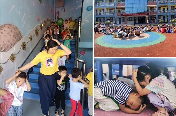 此次演练活动分为室内紧急避险和室外应急疏散演练两个部分。演练前,幼儿园事先制订了详细的演练方案,并就此次活动召开了专题会议,对演练的各项事宜进行了周密的部署。各班级通过“九一八”对幼儿展开了爱国主义教育。上午9时10分,各班级依照常规按部就班的开展一日活动,突然,一声预先警报声在幼儿园上空响起,老师们立即停止手上的一切工作,告诉孩子们“地震来了,大家不要慌”并冷静的指挥大家闭眼、抱头、迅速躲到各自的桌子底下和墙角边进行紧急避险。