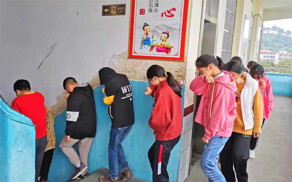在现场,当地震报警响起后,学生们低下身子,听从老师的指挥,迅速抱头、闭眼、蹲到课桌底下,做好基本的自救行为。地震一停,按照事前设定的安全逃生路线,迅速有序地撤离教学楼,跑到指定的安全地带。