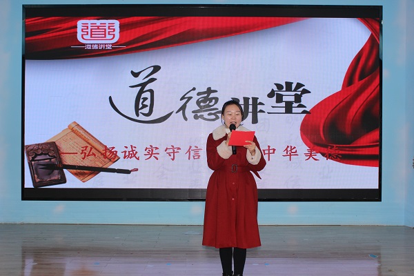 紧接道德讲堂活动围绕“唱首歌、看视频、讲故事、学模范、作承诺”5个环节有序开展。《公民道德歌》拉开了本次道德讲堂活动的序幕,歌声唱出了老师们内心对道德的崇高敬意;中国“诚实守信”好人---刘峰的事迹介绍, 刷新了老师们对诚实守信的认知,深刻的教育意义提高了老师们对人生观、价值观的认知;诚信的故事告诉我们诚实守信的重要性;文明家庭的评选活动彰显着榜样的平凡与伟大,她们用自己的实际行动来阐述诚实守信的内涵;最后,老师们发自肺腑的承诺,表示要将诚信铭记在心中,做新时代四有好老师。