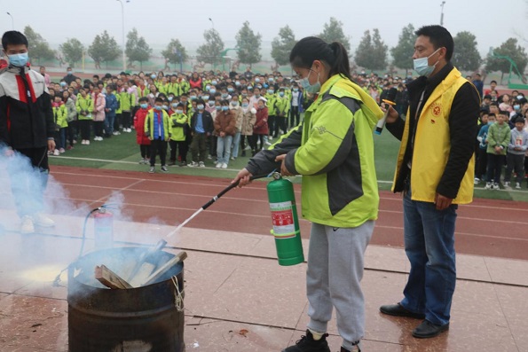 学校安全负责人曾祥金向全体师生讲解干粉灭火器的构造以及使用方法,他一边讲解演示,一边让部分学生上台操作干粉灭火器对现场小型模拟火点进行灭火,让大家亲身感受在火场应该如何正确使用消防设备。