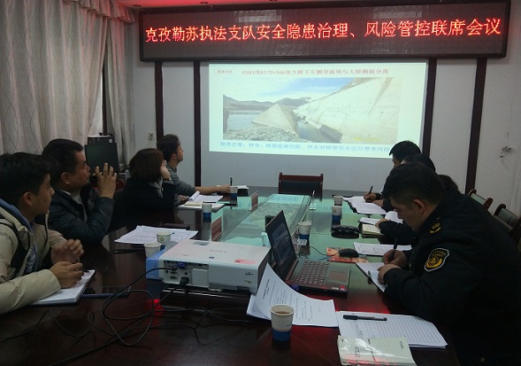 克孜勒苏执法支队使用幻灯片形式通报了2021年安全生产专项整治“集中攻坚年”国省干线未整改的安全隐患情况和排查的安全风险情况。阿图什公路管理局、新疆交投公司阿图什分公司根据管辖路段和职责对未整改的11处隐患一一提出整改时限和具体措施,同时与会人员根据风险识别管控要求、公路安全技术专业规范和养护管理经验,对我支队排查的14大类安全风险进行评估定级并提出具体管控措施。