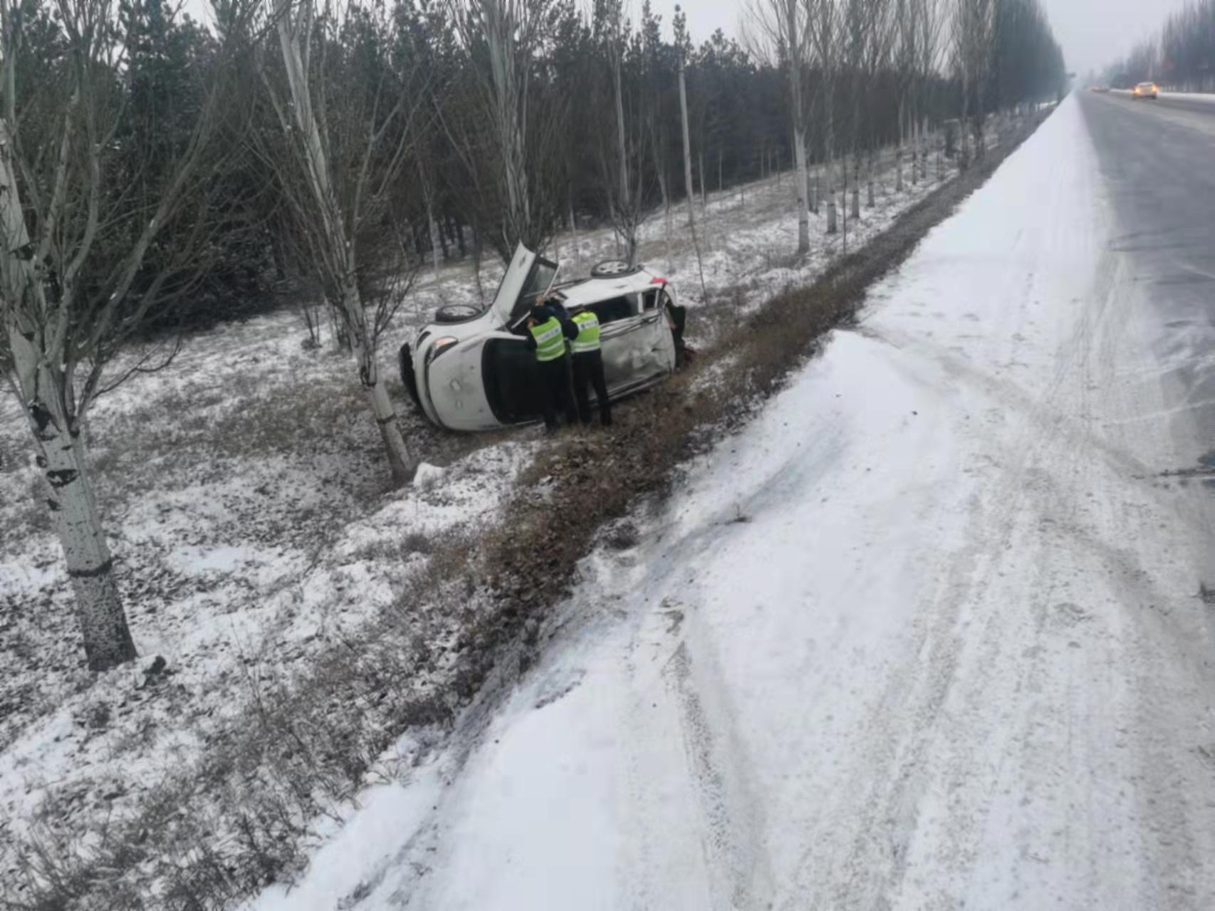 17时30分左右,新家园中队和事故中队在206省道巡逻时发现一辆白色轿车直冲沟内,执勤民警立即下车,将失控车辆司机及其家属救出,并联系施救车辆将车拖到公路上来。后据民警了解,轿车与前车跟的太紧,前车在行驶中突然减速,使轿车躲闪不及冲入沟内,庆幸没有造成人员伤亡,执勤民警告诫驾驶员雪天务必减速慢行,驾驶员对执勤民警的救助表示感谢。
