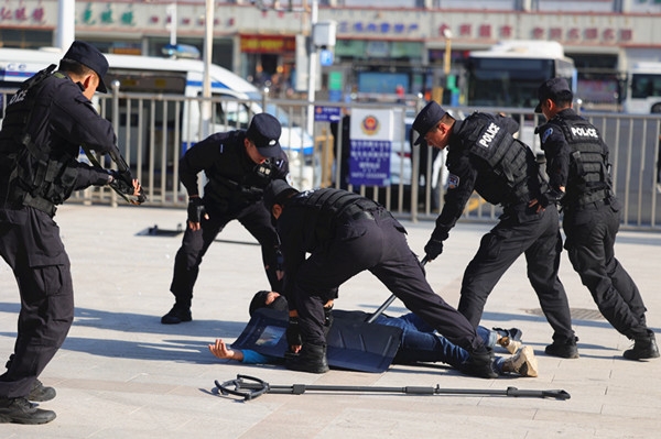 演练中,一名“暴徒”欲携带凶器闯入火车站,在人群密集的车站广场肆意砍杀,车站派出所执勤民警发现警情后第一时间携带警用防暴装备前往处置,同时立即将情况通报驻站特警。随后,派出所民警和赶来增援的特警队员按照反恐处突应急预案进行处置。一组民警快速疏散周边旅客,另一组民警则利用钢叉、盾牌等反恐防暴警械迅速将持刀“暴徒”制服并带离现场,及时排除了险情。