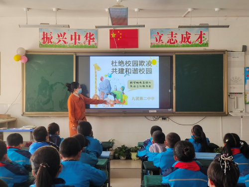 为加强校园安全管理,预防校园欺凌事件的发生,确保学生身心安全、健康成长。新疆生产建设兵团第一师阿拉尔市九团第二中学结合本校“人人小红星,颗颗亮晶晶“的校园文化,开展了“杜绝校园欺凌,共建和谐校园”教育活动。