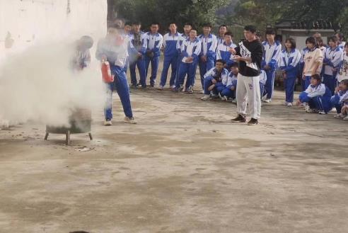 灭火器使用演练,先有老师讲解使用步骤,然后进行示范。再从全校学生中随机抽取12位同学,依次进行灭火实操。