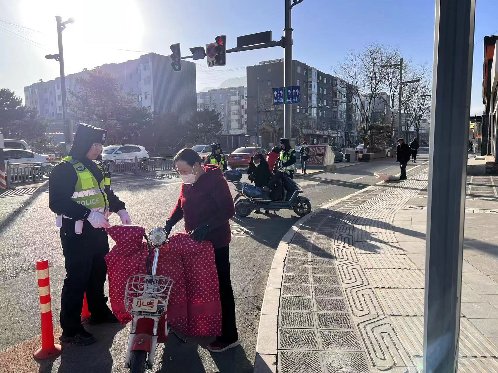 行动中,民警们利用早、午高峰,依托东门、迎宾等主要岗区等车流、人流量大的路段开展整治,对于电动二轮车、三轮车和摩托车驾乘人员未佩戴安全头盔等交通违法行为,按照“教育为主、处罚为辅”的工作原则,对存在的交通陋习采取了就地治理、就地教育、就地引导等措施,面对面向违法行为人讲解发生交通事故时戴头盔与不戴头盔所带来的不同后果,并要求当场佩戴好头盔后方可放行。同时,设置文明交通“体验式劝导”点,组织未佩戴安全头盔人员当一次“道路交通安全劝导员”,让他(她)们手挥彩旗,协助民警对存有道路交通违法行为的非机动车驾驶人和行人进行拦截教育劝导,纠正及劝导不文明交通违法行为。