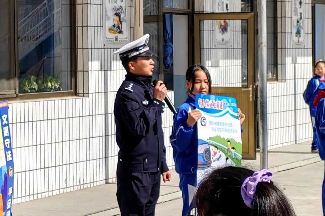 五大队民警联合岢岚县坪后沟学校开展“全国中小学生安全教育日”主题宣传活动,活动中,民警利用学校升旗仪式进行交通安全现场宣讲,组织学生了解掌握交通指挥手势,通过室内多媒体教学进行“行人禁止进入高速”、“一盔一带”安全防护以及日常交通安全知识普及,积极提高中小学生交通安全意识和风险防患能力。