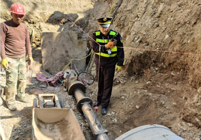 执法人员与施工人员共同对顶管的直径、厚度、长度,作业坑的深度、长度、宽度等进行现场勘验,并查看安全警示区域设置是否规范,施工单位是否严格按照施工设计及施工方案进行施工。执法人员对现场负责人作出以下要求:一是要求施工单位严格按照涉路许可的施工现场管理方案施工;二是要求施工单位按规定设置安全警示标志,现场作业人员必须按施工规定着安全标志服、戴安全帽,并设置专职安全员;三是要求涉路施工单位做好施工检查记录,切实消除安全隐患,保障辖区公路安全畅通。
