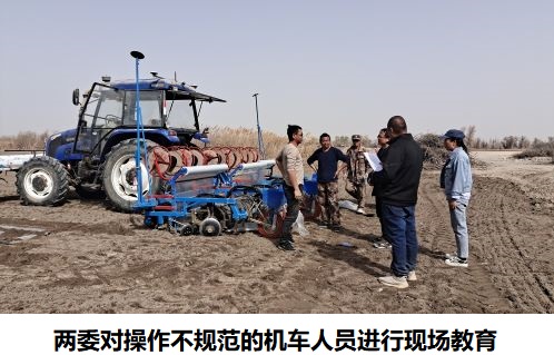 网格下的两委深入连队田间地头,对田间作业的整地机、播种机进行全面检查,检查内容包括车辆反光膜粘贴、驾驶员证件是否有效,严禁机车驾驶员无证、无牌驾驶机车。检查中发现,个别机车人员未按照规定穿反光服,两委成员对不符合操作规范的机车驾驶员进行教育,现场督促整改。