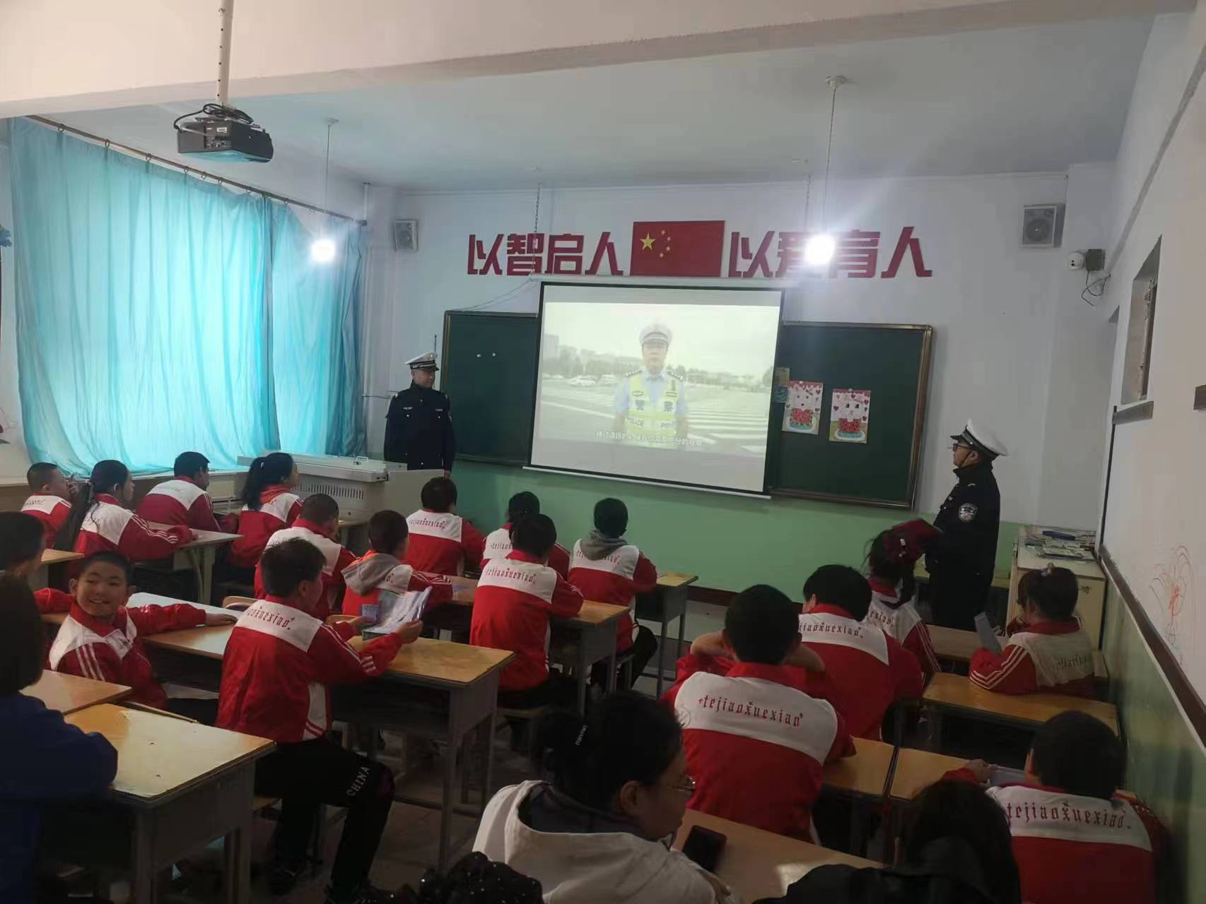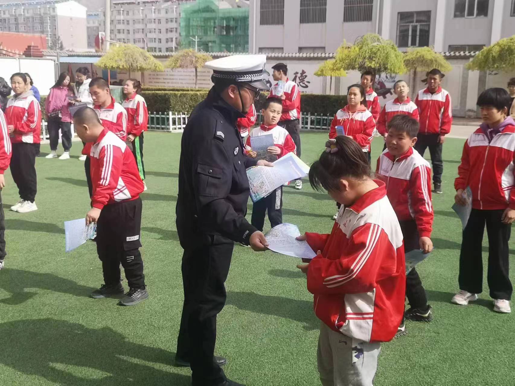 活动中,民辅警们为师生们播放了《孩子,等你平安回家——未成年人交通安全教育警示片》,并从日常参与交通行为的行走、骑车、乘车等三个方面开展安全知识普及教育,教育大家不要在马路上嬉戏打闹,走路时要留心观察路面情况,做到“一慢、二看、三通过”。随后,民辅警们利用课间操时间,向学生们发放了交通安全宣传资料,鼓励学生通过“小手拉大手”把交通安全知识带给家人,让交通安全知识深入每一个家庭。