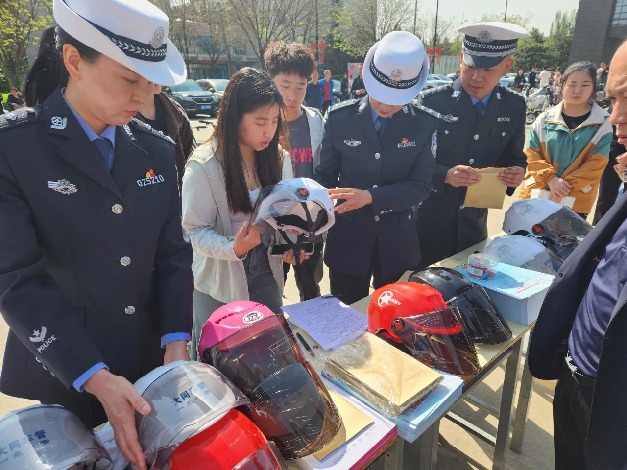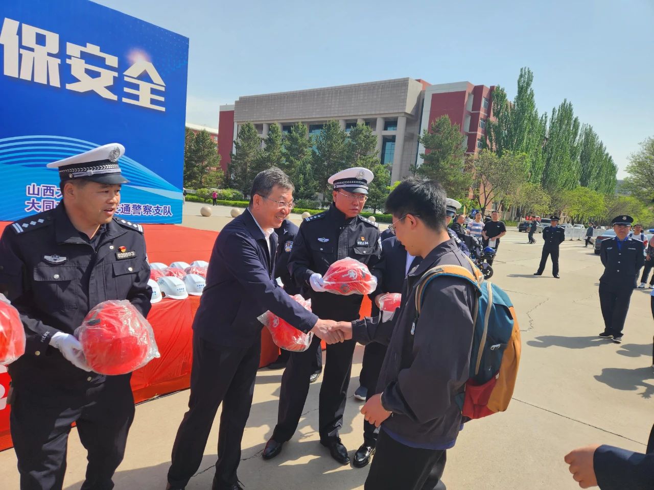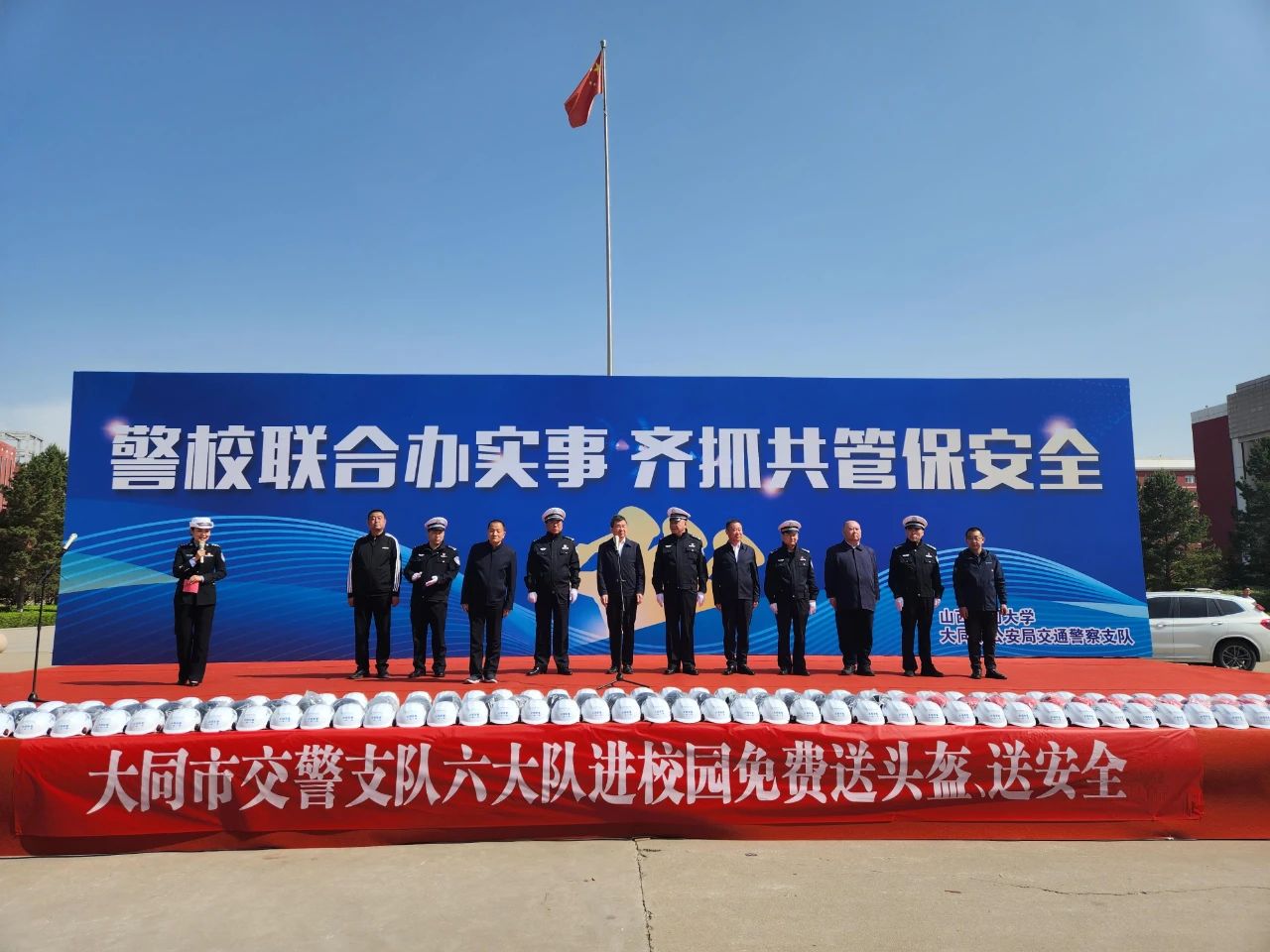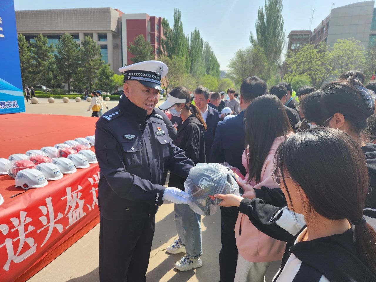 2023年5月12日上午,山西省大同市公安局交警支队携手山西大同大学开展“警校联合办实事 齐抓共管保安全”主题宣传活动,现场为广大师生免费送头盔、送安全知识,为符合条件的电动自行车登记牌照。山西大同大学党委常委、副校长张旻,交警支队党委副书记、政委王栋,交警支队副支队长张世忠参加送头盔仪式,学校教职员工、大学生和交警代表共200余人参加活动。