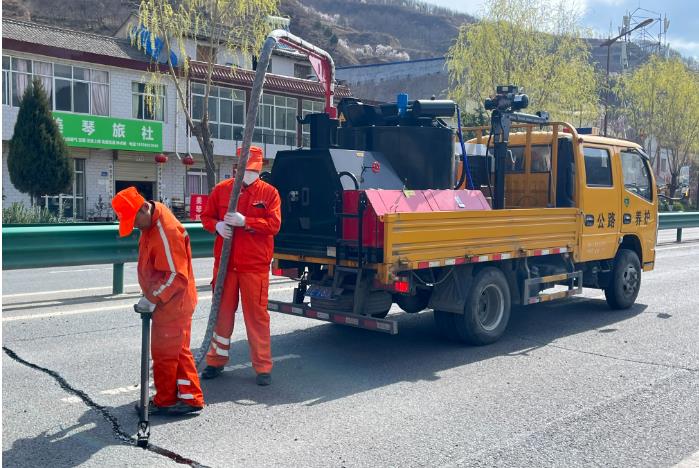 因路制宜,提前筹划。受冬季雨雪天气和重型货车碾压等因素的影响,秦州公路段管养的G247线、G316线部分路段出现路肩破损、路面开裂、小坑槽等病害,影响了过往车辆行车的安全性和舒适感。按照“有缝必灌、早灌早好”的原则,该段制定科学的路面灌缝施工方案,应用新型Sealtight173型灌缝胶,组织专业技术人员跟班作业,现场监督指导施工作业流程,坚持质量第一、安全第一,加强科技与实际结合应用,以高效、便捷、环保等符合时代特点的“四新技术”支撑施工作业,严格按照划线、开槽、清缝、灌注工艺程序规范作业流程,确保开槽精准、清缝彻底、灌缝饱满、路面整洁、线条美观,保障了灌缝施工质量。