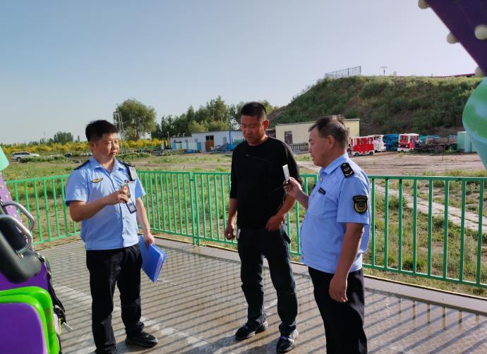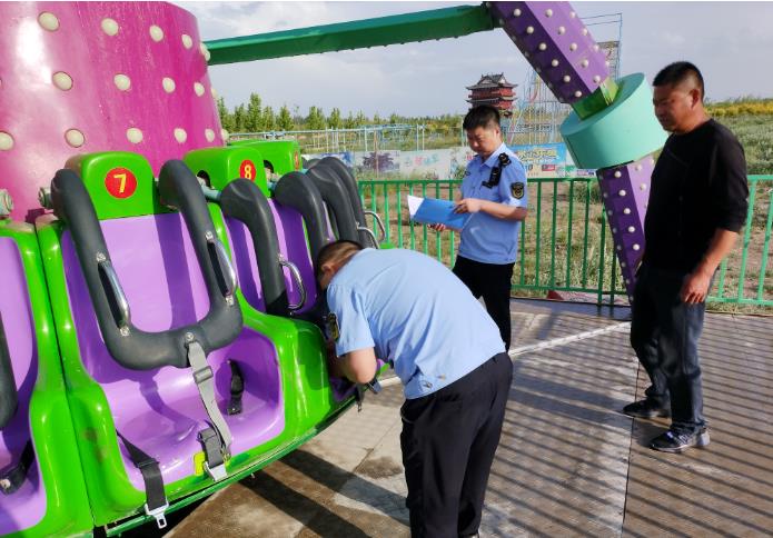 2023年5月30日,沙雅县市场监督管理局出动4名工作人员,对经营有特种设备游乐设备的沙雅县恒瑞游乐有限责任公司进行检查。实地查看摆锤、旋转塔、埃及冒险设备的运行,警示标志、乘客须知张贴,查阅设备的日常巡查及维护档案等。