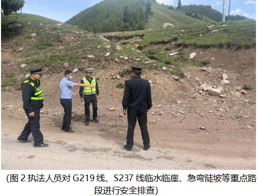 S237线上伊昭公路被誉为网红“小独库”,6月中旬该路段将逐步恢复通行,迎来旅游高峰期,为扎实做好G219线、S237线的交通安全,助力当地交通与旅游融合发展,昭苏执法大队联合昭苏县交通运输局、昭苏县公安交警大队对G219线、S237线的交通安全进行了全面“体检”。