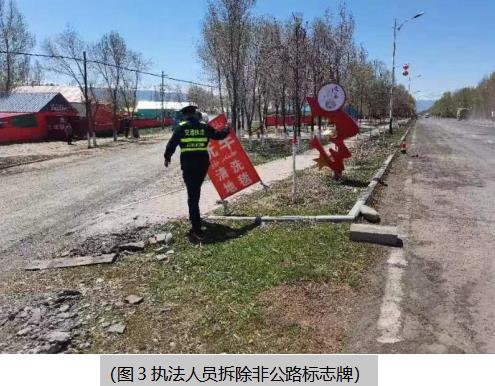 此次联合检查重点针对G219线、S237线临水临崖、急弯陡坡等重点路段的路面、桥梁、涵洞、公路附属设施、排水泄洪设施认真进行排查,做到隐患信息明确清晰、隐患治理及时跟踪、不断巩固公路安全整治成果,消除公路安全隐患。联合安全检查排查出3处公路安全隐患,已下发公路安全隐患告知书2份,告知公路养护单位进行修复,1处安全隐患已告知产权单位现场消除。同时随着G219线、S237线旅游公路即将开通,针对沿线企业和个体农户设立非公路标志牌违法行为随之增加的问题,在联合安全检查的过程中,执法人员向辖区群众大力宣传法律法规、讲述设立非公路标志牌危害,在共同确认违法行为的前提下拆除非公路标志牌5块,清除路面障碍物2处,为旅游交通安全奠定了坚实的基础。