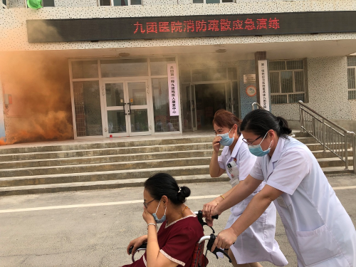 此次演练模拟医院住院楼医技科药库发生火灾,大火迅速蔓延,浓烟滚滚,严重威胁到现场人员生命及造成巨大财产损失。医技科工作人员发现火灾后,迅速报告科主任并准备扑灭初期火灾。拨打119报警电话,并向医院办公室进行汇报。医院第一时间启动应急预案,开展救援,各行动小组快速反应,密切配合,协同作战,迅速控制火势、疏散群众。