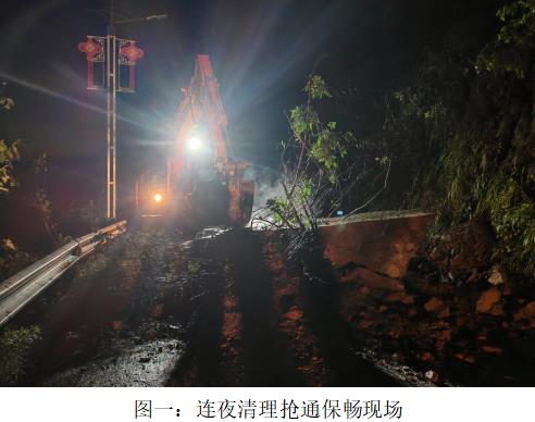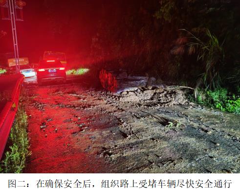 塌方现场,树木、泥土、巨石等覆盖道路,其中一块巨石长约3.5米,重约4吨,横亘在道路中间,几乎堵住了整条道路。由于夜幕降临,巨石较大,抢险队员组织挖掘机和清运车辆将暂时不能搬运的巨石推移至路边,对树木、石块、泥土等进行清运。经过两个小时的艰苦作业,抢运出一条便捷通道,在确保安全后,组织路上受堵车辆尽快安全通行。大家对镇、村两级抢险队员发扬“端午放假不放松,坚守岗位保平安”的工作精神给予了充分肯定和高度赞扬。