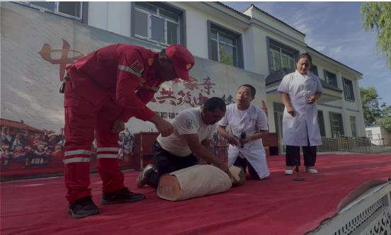 (图为艾麦尔·吐尔迪、村医努日曼古丽、工作队队员进行心肺复苏演示)