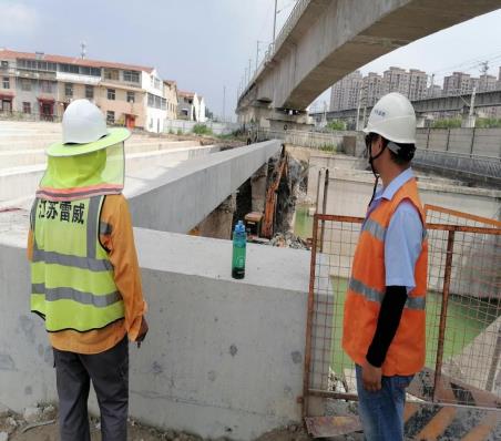 图为徐州市三环南路工程(涉铁标)监理站副总监陈绳宣(左二)现场把关
