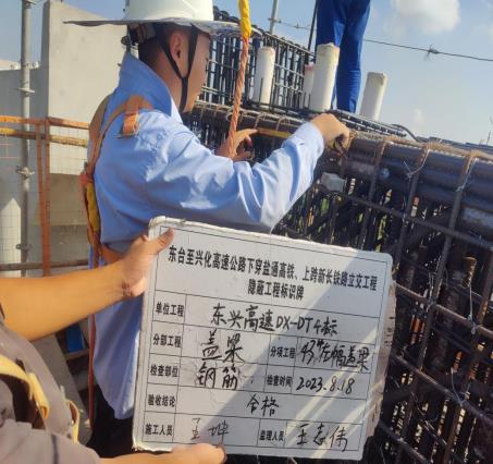 图为监理人员验收东台至兴化高速公路下穿铁路立交桥工程钢筋绑扎