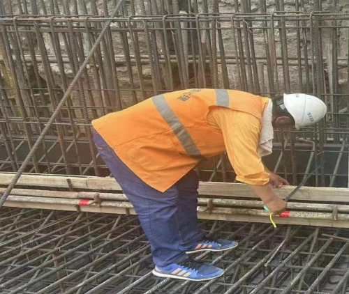 图为东兴上跨新长铁路立交工程监理站监理员颜承喜检查墩柱钢筋