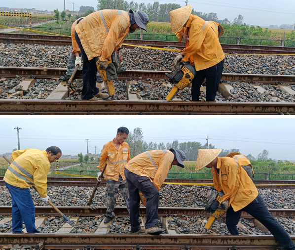 9月19日中午,安徽亳州地区普降大雨。在京九下行线K780+700公里处,几名“黄马夹”利用天窗时间冒雨使养护线路设备。现场防护人员站在不远处,认真瞭望车辆,守护现场安全。临近国庆中秋“双节”,杭州亚运会即将开幕之际,中国铁路上海局集团有限公司阜阳工务段亳州线路车间组织劳力重点处理设备病害,严控现场作业安全,不断提升列车运行品质,全力确保铁路运输畅通。