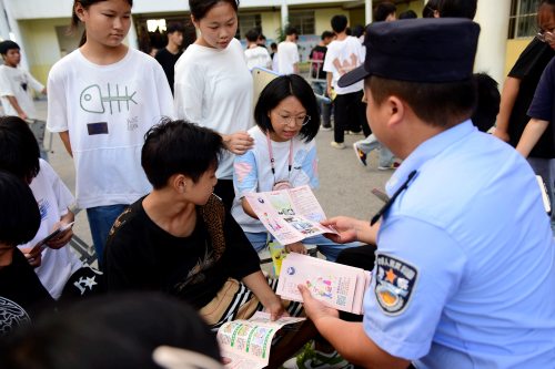 2023年9月19日,在贵州省黔东南苗族侗族自治州从江县洛香中学,禁毒办警官给学生发放禁毒知识宣传资料。