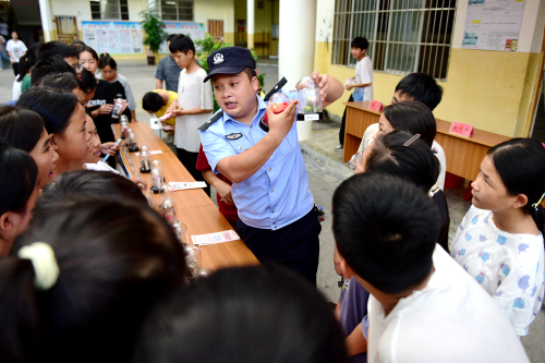 2023年9月19日,在贵州省黔东南苗族侗族自治州从江县洛香中学,禁毒办警官教孩子们辨别毒品。