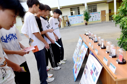 2023年9月19日,在贵州省黔东南苗族侗族自治州从江县洛香中学,学生在观看仿真毒品模型。
