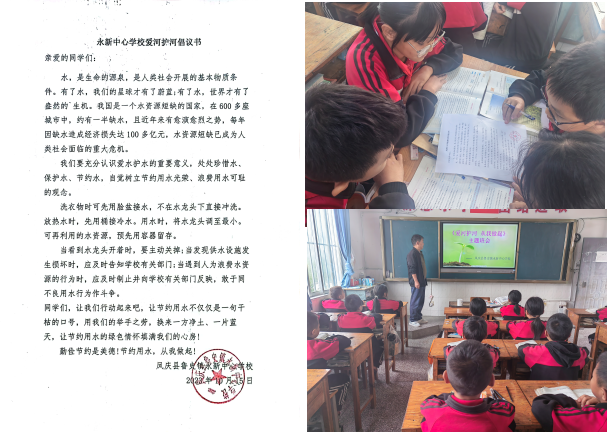 加强宣传引导,营造良好氛围。学校通过国旗下讲话、班级主题班会、黑板报、粘贴标语、校园广播、发放倡议书等多种形式,进行“浸润式”广泛宣传教育,引导学生从身边点滴小事做起,树立绿色文明理念,增强他们爱河护河和主人翁的意识,鼓励他们积极投身到保护家乡的江河库湖、爱护生态环境的社会实践中去,增强学生对家乡河流保护的责任感和使命感。