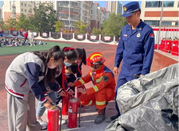 三是讲解灭火器使用方法。全校师生安全逃离至操场后,消防员向大家细心讲解了干粉灭火器的使用方法,并进行灭火演示,师生代表积极参与灭火实操,教学现场全体师生热情饱满,聚精会神,做到了“听”“看”“学”“践”,同学们收获满满,其乐无穷。