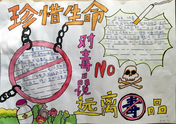首先,五二班学生代表进行了“珍爱生命 远离毒品”的国旗下讲话,强调了毒品对青少年的危害是多么的恶劣,呼吁同学们远离毒品,珍爱生命。紧接着,各班开展禁毒主题班会,各班主任用通俗易懂的语言详细介绍了毒品的种类,同时结合案例,深入浅出地给学生分析了毒品的危害,用事实告诉学生们必须认清毒品危害,树立自我保护意识。各班主任还组织学生观看了禁毒视频,使学生更全面认识毒品的危害,学会了预防毒品的知识技能,自觉远离毒品。最后,同学们绘制了禁毒主题相关的手抄报,加强了禁毒宣传教育工作的力度,时刻提醒着广大学生远离毒品,珍爱生命。