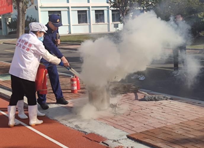 讲解完后,教官们组织师生及工作人员到空旷的场地进行了实操演练。食堂工作人员和同学们都通过亲自试用灭火器,掌握了消防灭火的使用方法和技巧。