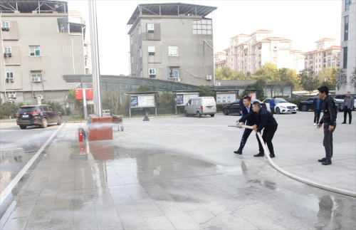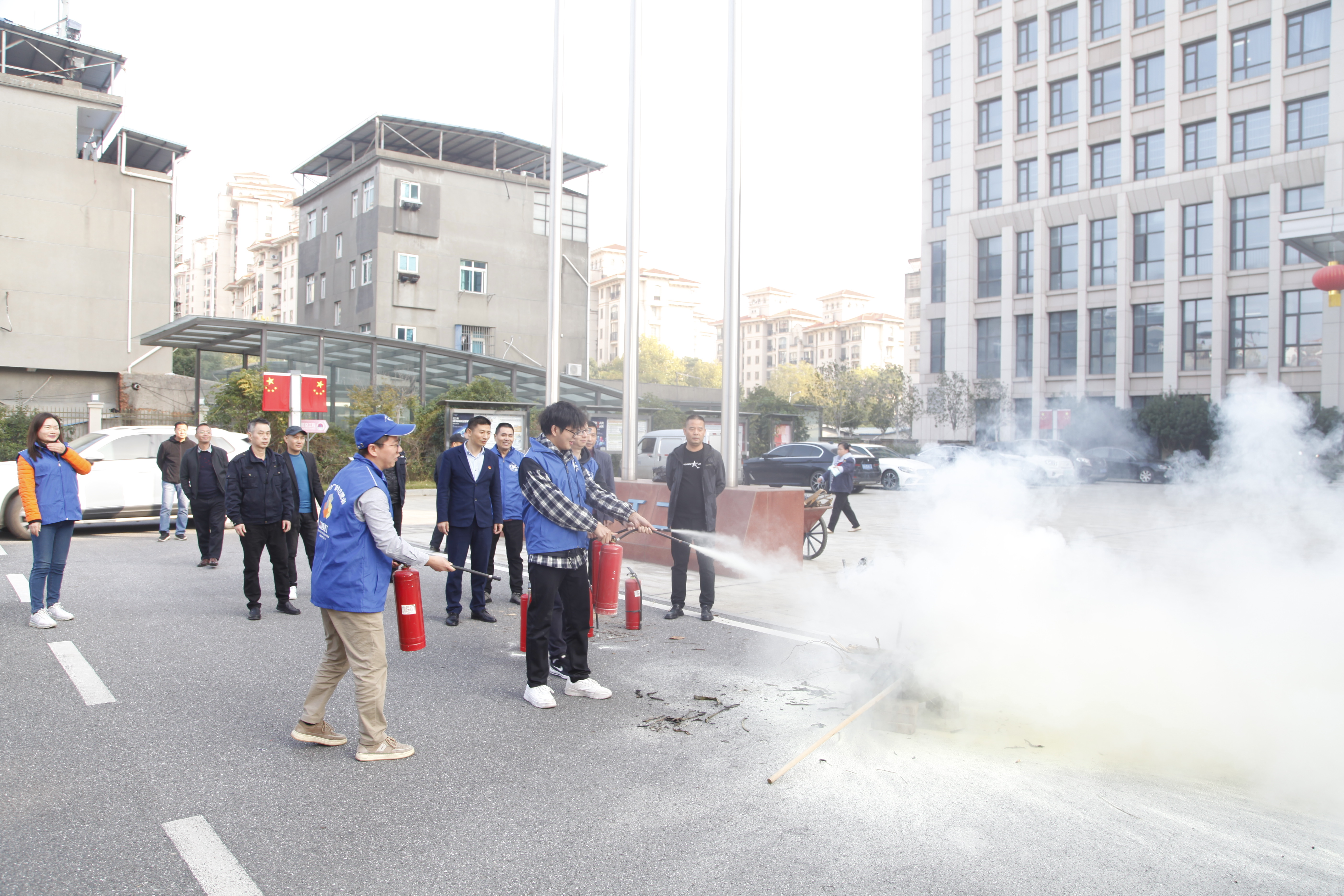 随后,大家来到大楼广场开始消防实战演习。此时,场地中心燃起熊熊大火,老师根据实际情况,教授大家在紧急情况下使用灭火器的核心要点以及消防水带的使用与收纳,并组织大家3人一组现场操作灭火器与消防水带。通过实地消防安全演练,参加人员基本掌握了电气火灾、燃气火灾、车辆火灾等安全隐患和防火措施、火场逃生自救方法以及灭火器、消防水带等消防用具的使用方法。