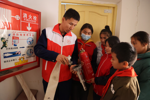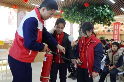 图为:11月24日,乌什县委宣传部联合乌什县消防救援大队在新时代文明实践中心举办消防安全知识普及暨“落实消防责任,防范安全风险”主题活动。学生们通过体验救生设备、安全使用消防器材等,在互动活动中学习消防知识,提升消防安全意识和应急避险能力。(外力·克依木 / 摄)