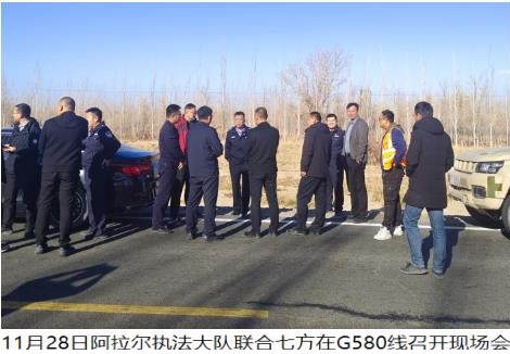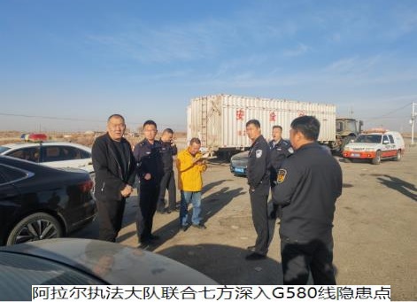 为深入冬季道路交通领域专项整治行动,有效消除道路运输安全隐患,大力改善国省道干线路域环境,进一步确保G580公路沿线通行环境安全,近日,阿拉尔执法大队联合阿拉尔公路分局、阿拉尔公安交警支队、第一师交通运输综合行政执法支队、阿拉尔市安监局、十一、十二、十三团团场共同开展道路交通安全联查联治活动,助推辖区G580线路域环境安全整治取得成效,实现保安全、保畅通的工作目标。