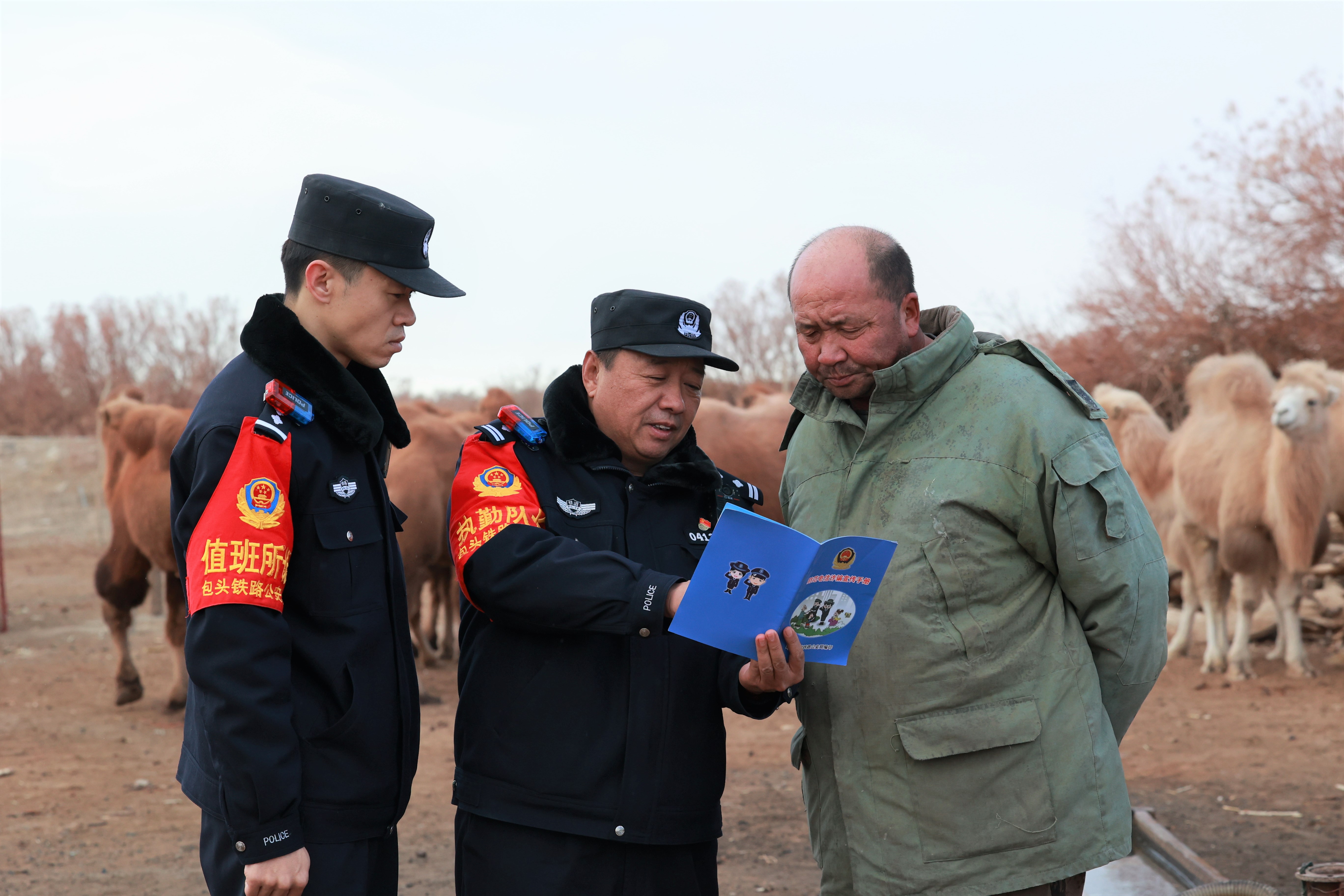 各派出所持续深化“携手护路、利剑除患”专项行动,稳步推进线路“纵深阵地”建设,统筹推进冬季线路治安整治专项行动,深入辖区重点区段,采取“车巡+步巡”相结合的方式,对桥梁、隧道、涵洞等重点部位开展隐患排查,并针对发现的隐患进行督导整改,进一步提升线路治安防控水平;乌海、东胜东、拉僧庙等车站派出所深入沿线村社,持续深化“百万警进千万家”活动,走进百姓家中,普及讲解铁路安全常识,宣讲相关法律知识,全面提升群众安全意识,筑牢安全防线。图为额济纳车站派出所民警开展线路法制宣传。(通讯员:包头铁路公安处 宋艺轩)